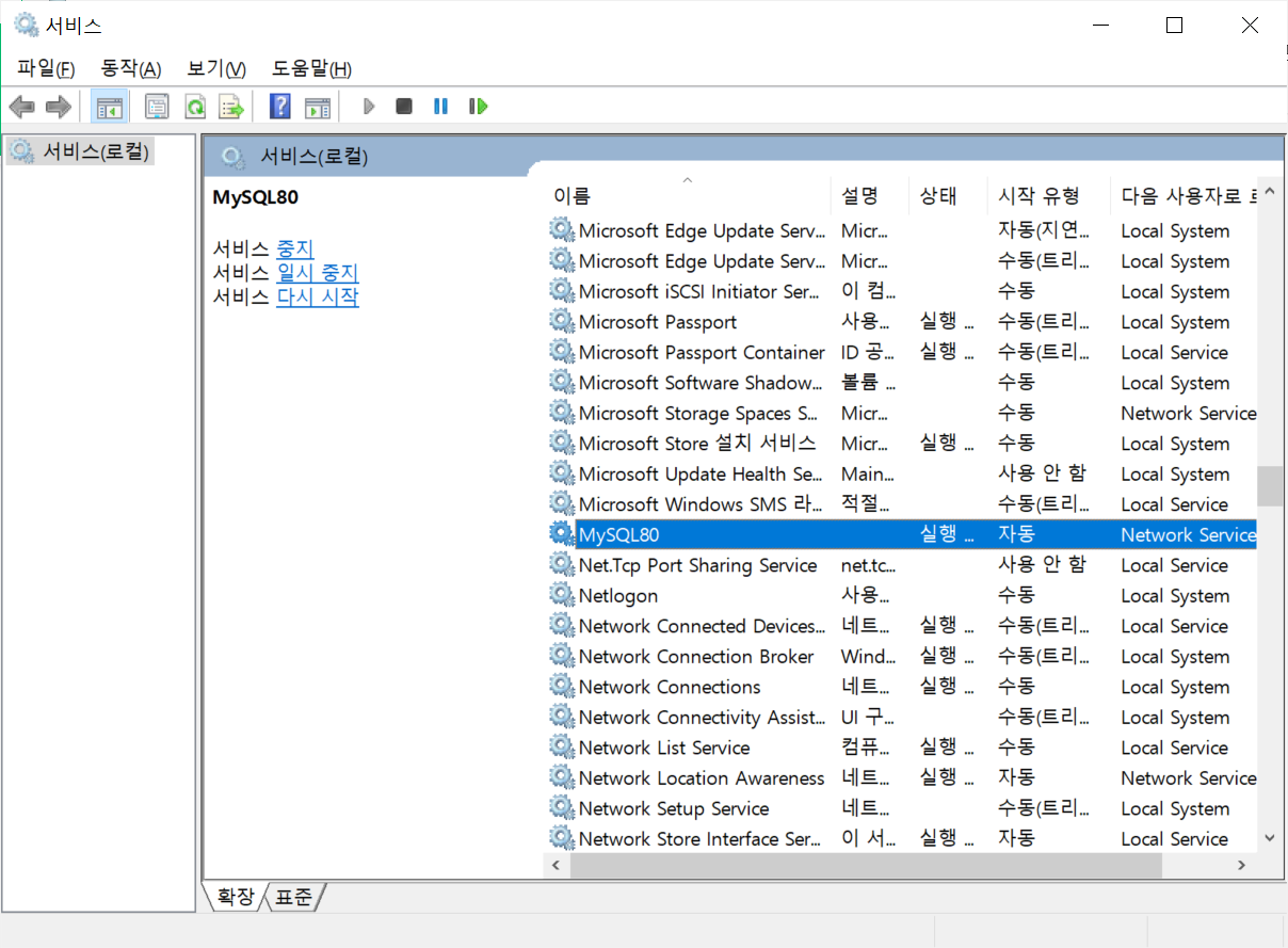 4. 윈도우 검색창에 '서비스' 검색 후 MySQL 서버 재시작