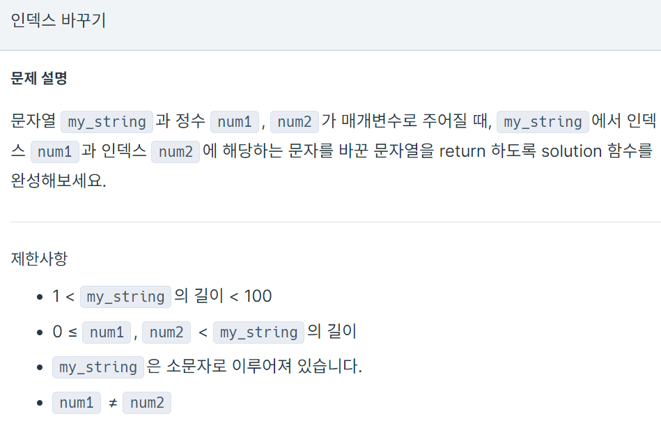 문자열 my_string과 정수 num1, num2가 매개변수로 주어질 때, my_string에서 인덱스 num1과 인덱스 num2에 해당하는 문자를 바꾼 문자열을 return 하도록 solution 함수를 완성해보세요.