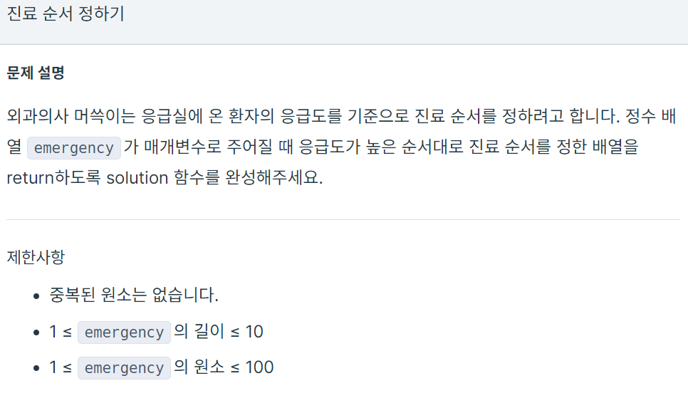 외과의사 머쓱이는 응급실에 온 환자의 응급도를 기준으로 진료 순서를 정하려고 합니다. 정수 배열 emergency가 매개변수로 주어질 때 응급도가 높은 순서대로 진료 순서를 정한 배열을 return하도록 solution 함수를 완성해주세요.
