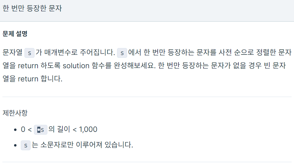 문자열 s가 매개변수로 주어집니다. s에서 한 번만 등장하는 문자를 사전 순으로 정렬한 문자열을 return 하도록 solution 함수를 완성해보세요. 한 번만 등장하는 문자가 없을 경우 빈 문자열을 return 합니다.