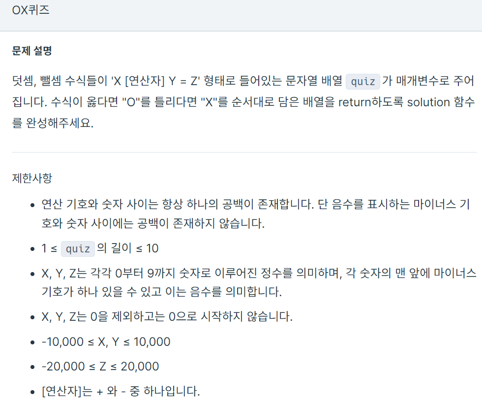 덧셈, 뺄셈 수식들이 'X [연산자] Y = Z' 형태로 들어있는 문자열 배열 quiz가 매개변수로 주어집니다. 수식이 옳다면 "O"를 틀리다면 "X"를 순서대로 담은 배열을 return하도록 solution 함수를 완성해주세요.