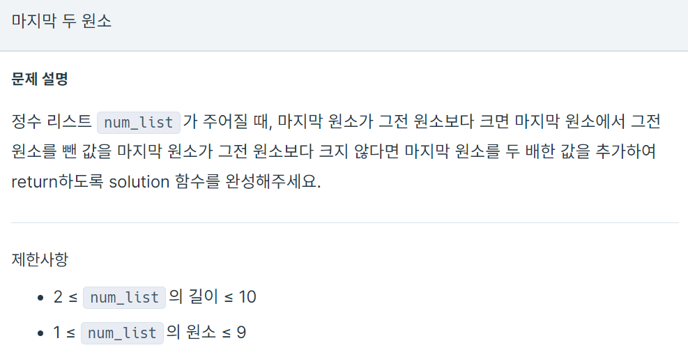 정수 리스트 num_list가 주어질 때, 마지막 원소가 그전 원소보다 크면 마지막 원소에서 그전 원소를 뺀 값을 마지막 원소가 그전 원소보다 크지 않다면 마지막 원소를 두 배한 값을 추가하여 return하도록 solution 함수를 완성해주세요.
