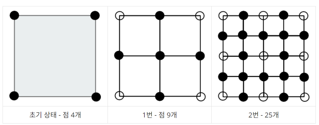 아래 그림은 과정을 총 2번 거쳤을 때까지의 모습이다.