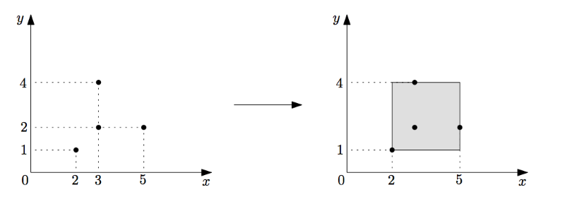 예를 들어 위와 같이 (2, 1), (3, 2), (5, 2), (3, 4) 네 점에서 옥구슬을 발견하였다면, 임씨에게 돌아갈 대지는 (2, 1), (5, 1), (2, 4), (5, 4)를 네 꼭짓점으로 하는 직사각형이며, 넓이는 (5 - 2) × (4 - 1) = 9 가 된다.