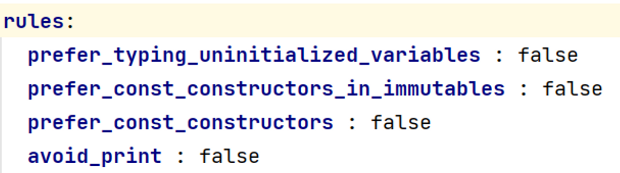analysis_options.yaml에 rules 아래에 4줄 코드 작성 → Lint를 잠깐 끄는 용도