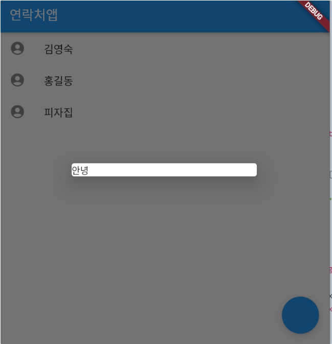 // 이건 context가 가져오는 정보가 없음 -> MaterialApp을 따로 빼줘야 함 build (context) { return MaterialApp( home: Scaffold( floatingActionButton: FloatingActionButton( onPressed: (){ showDialog( context: context, builder: (context){ return Dialog( child: Text('안녕'), ); }, ); }, ), // 이렇게 해야 됨 void main() { runApp( MaterialApp( // <- 여기로 빼주기 home: MyApp() ) ); } class MyApp extends StatefulWidget { MyApp({Key? key}) : super(key: key); @override State<MyApp> createState() => _MyAppState(); } class _MyAppState extends State<MyApp> { var like = [0, 0, 0]; var name = ['김영숙', '홍길동', '피자집']; @override Widget build(BuildContext context) { return Scaffold( floatingActionButton: FloatingActionButton( onPressed: () { showDialog(context: context, builder: (context) { return Dialog(child: Text('안녕')); }); }, ), appBar: AppBar( title: Text('연락처앱')), body: ListView.builder( itemCount: 3, itemBuilder: (c, i) { return ListTile( leading: Icon(Icons.account_circle_rounded), title: Text(name[i]), ); }, ) ); } } - 두 번째 방법 : 족보를 하나 더 만들기