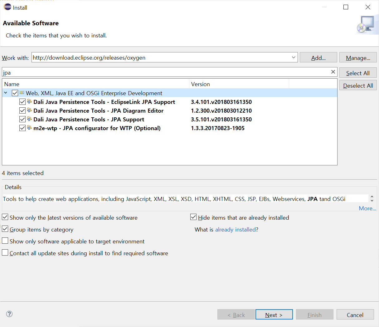 ( "type filter text" 항목에 JPA 라고 입력하면 쉽게 찾을 수 있음)