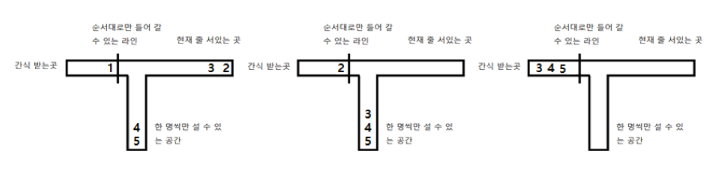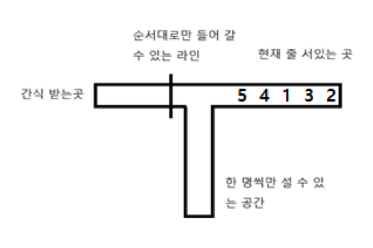 사람들은 현재 1열로 줄을 서있고, 맨 앞의 사람만 이동이 가능하다. 인규는 번호표 순서대로만 통과할 수 있는 라인을 만들어 두었다. 이 라인과 대기열의 맨 앞 사람 사이에는 한 사람씩 1열이 들어갈 수 있는 공간이 있다. 현재 대기열의 사람들은 이 공간으로 올 수 있지만 반대는 불가능하다. 승환이를 도와 프로그램을 완성하라.