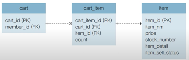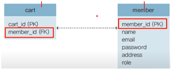 - 회원들은 각자 자신의 장바구니를 하나 갖고 있으며 장바구니 입장에서 봐도 자신과 매핑되는 한 명의 회원을 갖는 일대일 매핑 구조