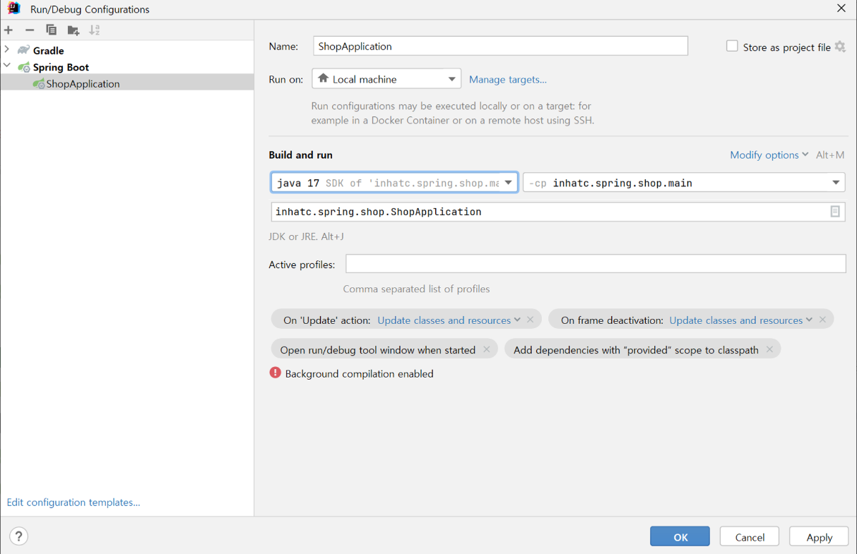 - File/Setting/Build, Exe../Build Tools/Gradle/Gradle JVM : 17로 설정