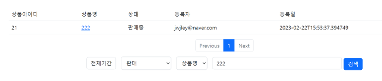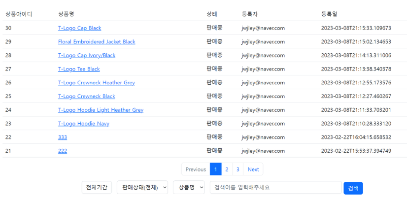 상품 목록 테이블 부분, 하단 페이지 부분, 검색 조건 부분 존재