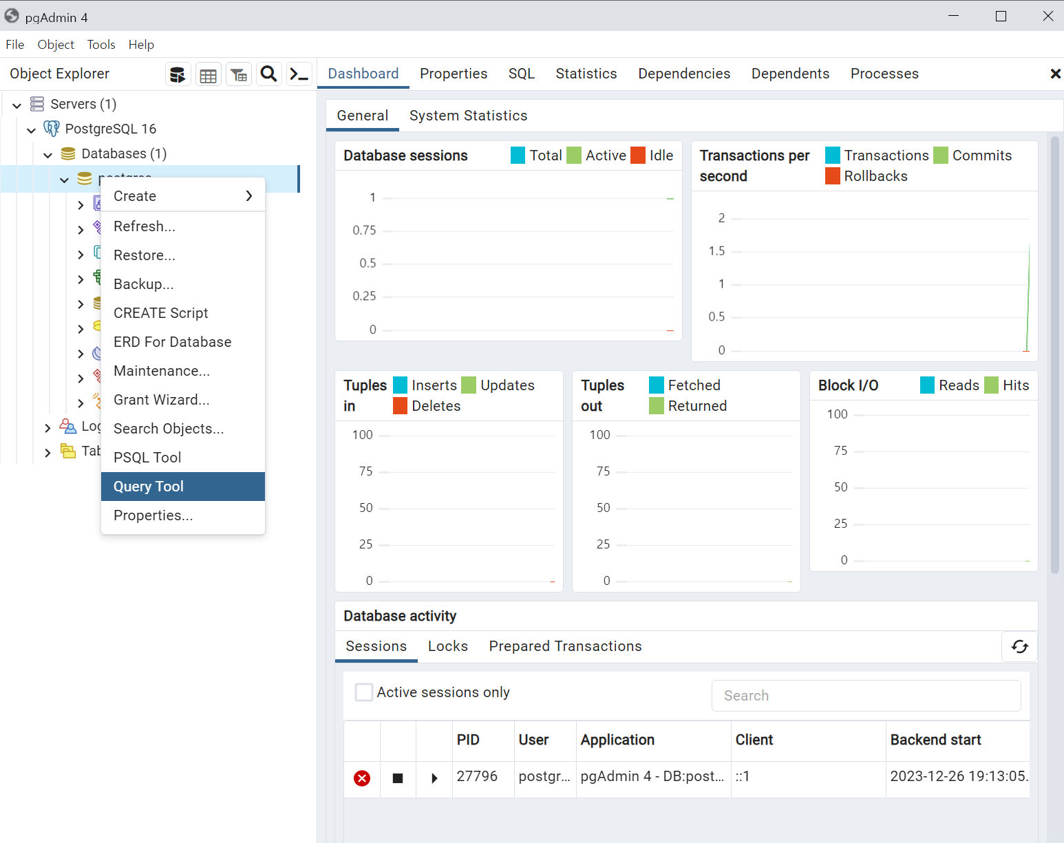 4. postgres 테이블 우클릭 → Query Tool을 입력하면 Query문을 입력할 수 있는 입력 창이 나옴