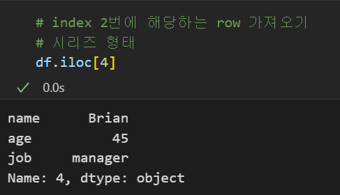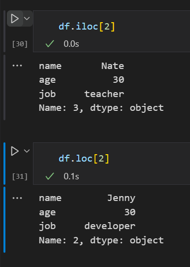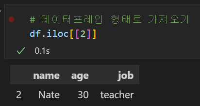 - iloc는 리스트 기준이기 때문에 변경 전 Nate를 가져오고 loc는 변경 후 2열에 있는 Jenny를 가져옴