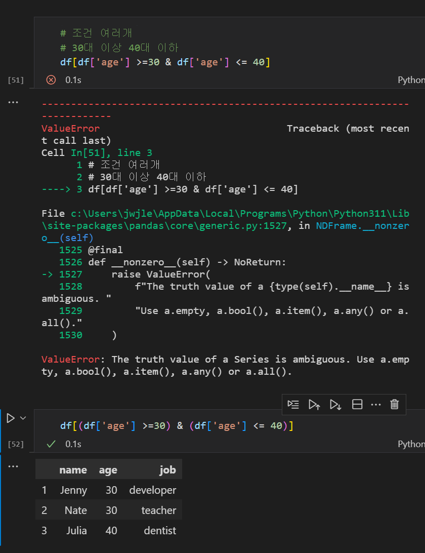 - and, or 연산의 경우엔 ( )로 묶고 &, | 사용