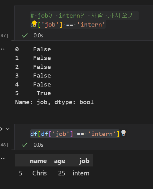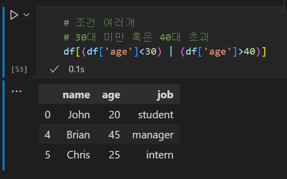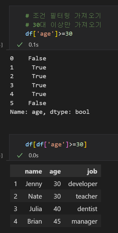 # df['age']>=30의 경우엔 불린형태로 가져옴
