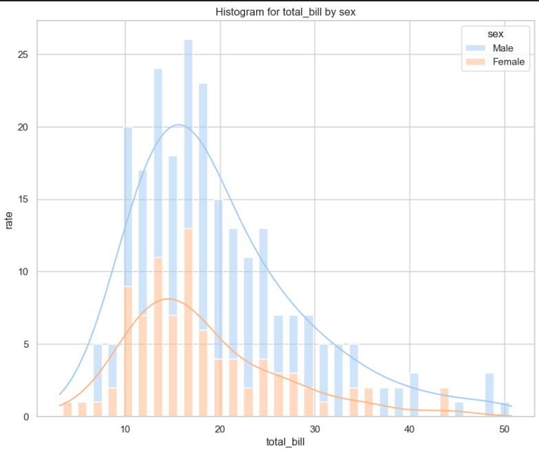 plt.title('Histogram for total_bill by sex') # 차트 제목