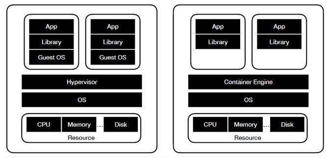- OS 수준에서의 가상화로, 필요한 라이브러리와 바이너리만 포함하므로 가벼움