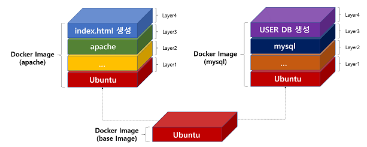 - ex) apache 이미지를 만든다고 하면, 기존의 Ubuntu 이미지를 base Image로 이용하고, 그 위에 필요한 다른 레이어들을 얹어서 만들 수 있음