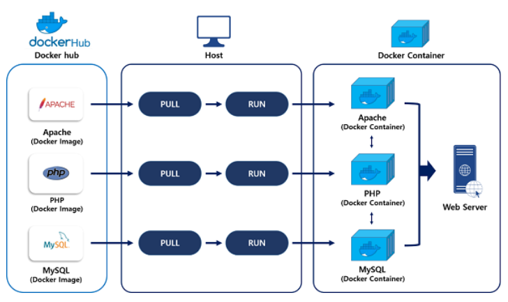 - 호스트들은 도커 허브에서 도커 이미지를 pull 해와서 실행시킬 수 있음