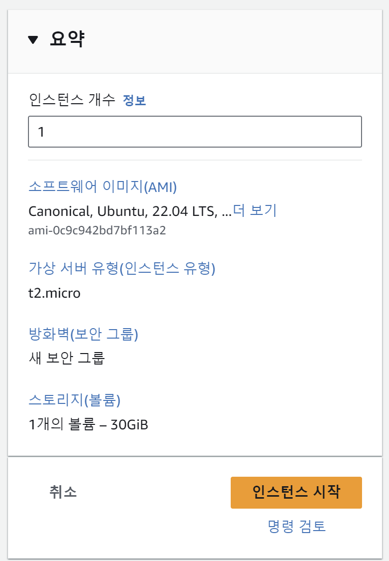 - 화면 우측 요약에서 인스턴스 시작 클릭