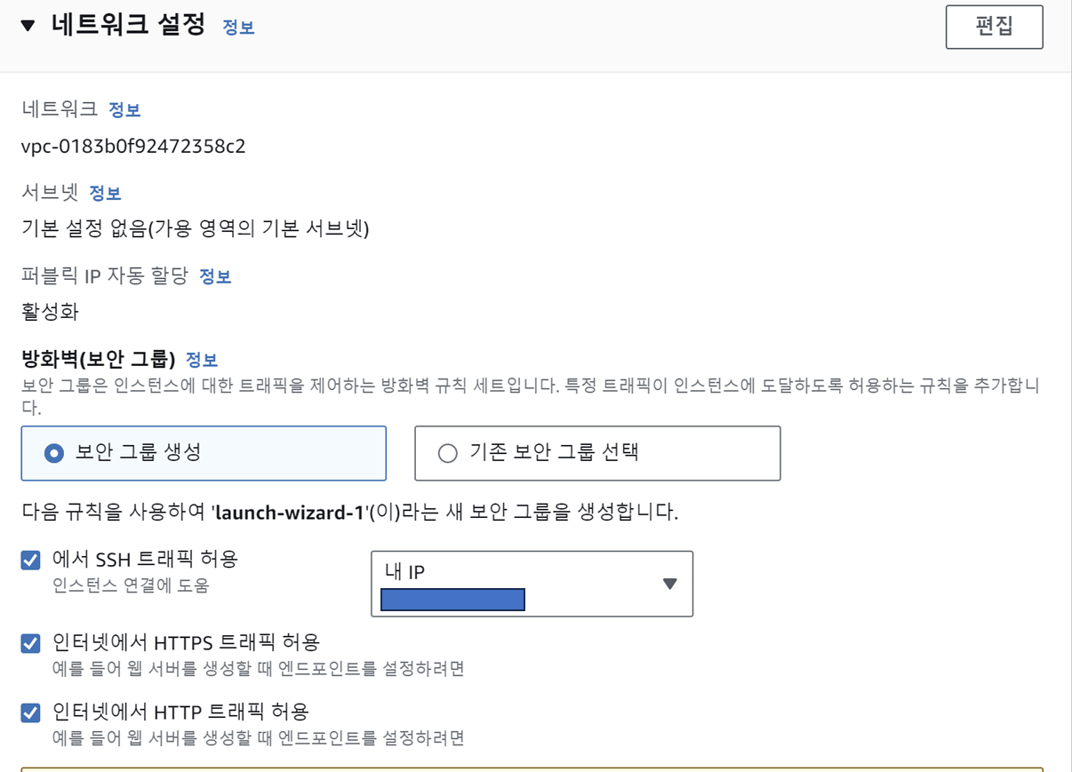 - 현재는 개인용으로 생성하고 있기 때문에 내 IP 선택