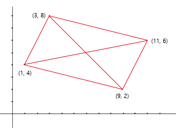 - 임의의 두 점을 이은 직선이 x축 또는 y축과 평행한 경우는 주어지지 않습니다.