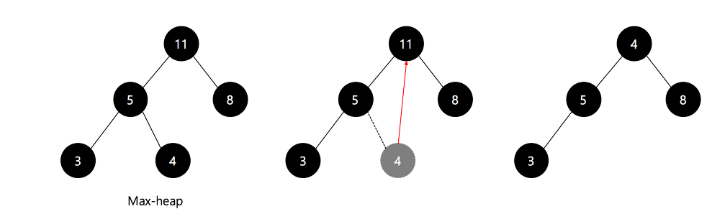 루트를 마지막 노드로 대체 (11 → 4), 다시 최대 힙 구성