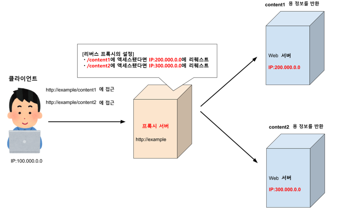 - 클라이언트에서 액세스를 프록시 서버에 집약해서 URL에 따라 리퀘스트를 받을 Web 서버가 바뀌도록 설정함