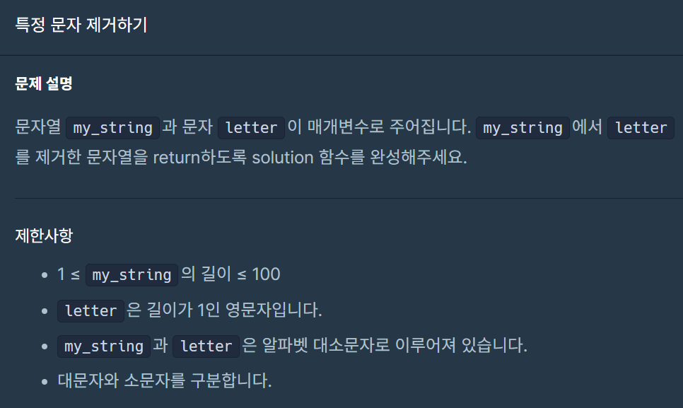 - my_string과 letter은 알파벳 대소문자로 이루어져 있습니다.