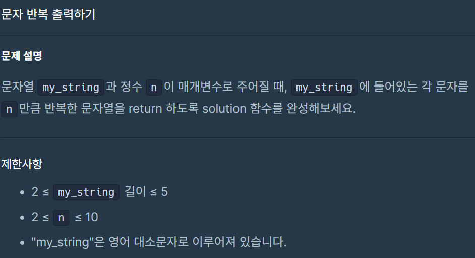 문자열 my_string과 정수 n이 매개변수로 주어질 때, my_string에 들어있는 각 문자를 n만큼 반복한 문자열을 return 하도록 solution 함수를 완성해보세요.