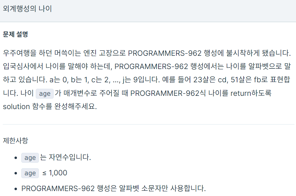 우주여행을 하던 머쓱이는 엔진 고장으로 PROGRAMMERS-962 행성에 불시착하게 됐습니다. 입국심사에서 나이를 말해야 하는데, PROGRAMMERS-962 행성에서는 나이를 알파벳으로 말하고 있습니다. a는 0, b는 1, c는 2, ..., j는 9입니다. 예를 들어 23살은 cd, 51살은 fb로 표현합니다. 나이 age가 매개변수로 주어질 때 PROGRAMMER-962식 나이를 return하도록 solution 함수를 완성해주세요.