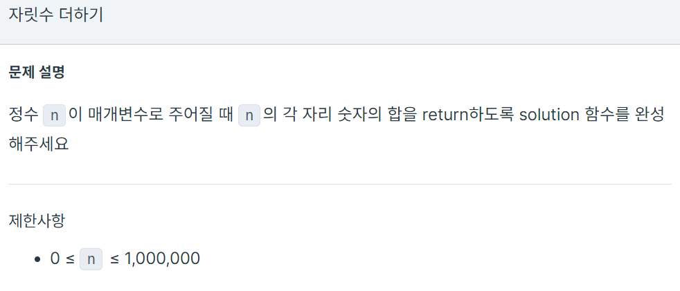 정수 n이 매개변수로 주어질 때 n의 각 자리 숫자의 합을 return하도록 solution 함수를 완성해주세요