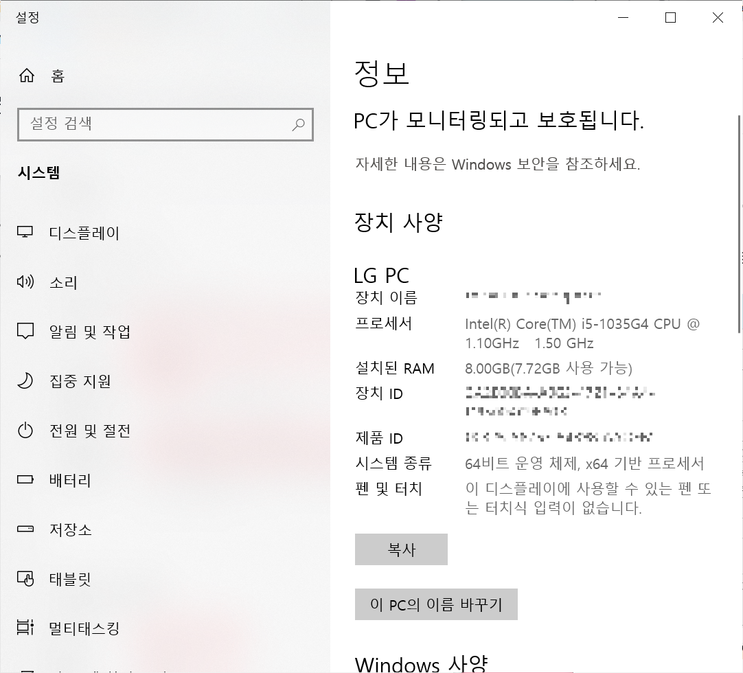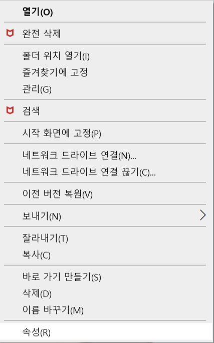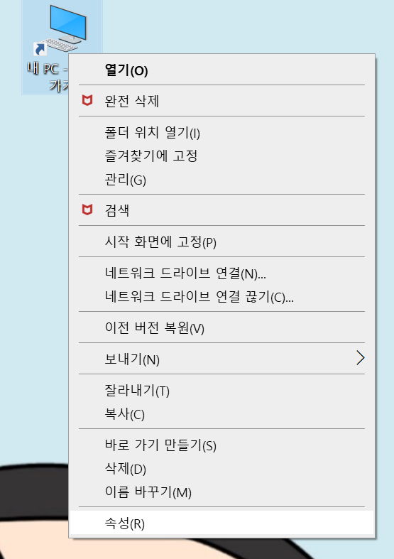 일단 '내컴퓨터(바로가기 X)'를 우클릭하고 속성을 클릭해줍니다. 그러면 이런 화면이 나와요.