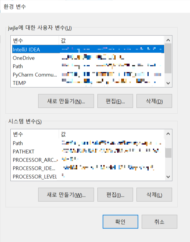 그리고 Path를 찾아서 편집을 눌러주면 맨 밑에 새로운 경로를 넣을 수 있도록 칸이 활성화 됩니다. 거기에 C:\Program Files\MySQL\MySQL Server 8.0\bin 경로를 넣어주고 확인 눌러주면 환경변수는 끝입니다.