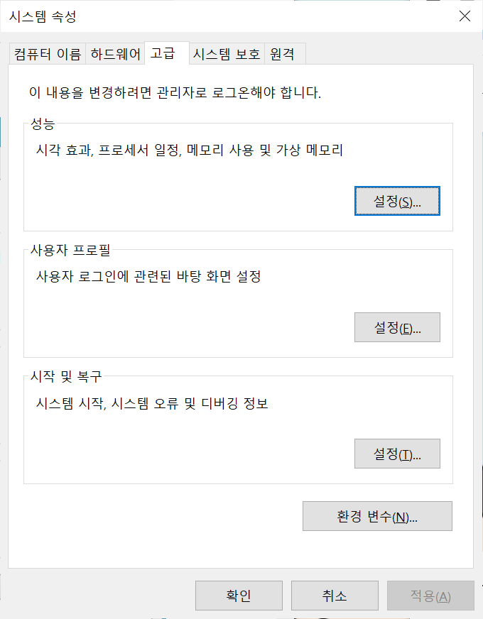 고급 탭에 맨 밑에 있는 환경 변수를 클릭해주세요.