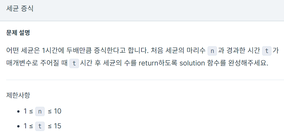 어떤 세균은 1시간에 두배만큼 증식한다고 합니다. 처음 세균의 마리수 n과 경과한 시간 t가 매개변수로 주어질 때 t시간 후 세균의 수를 return하도록 solution 함수를 완성해주세요.