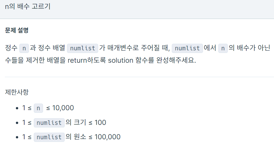 정수 n과 정수 배열 numlist가 매개변수로 주어질 때, numlist에서 n의 배수가 아닌 수들을 제거한 배열을 return하도록 solution 함수를 완성해주세요.