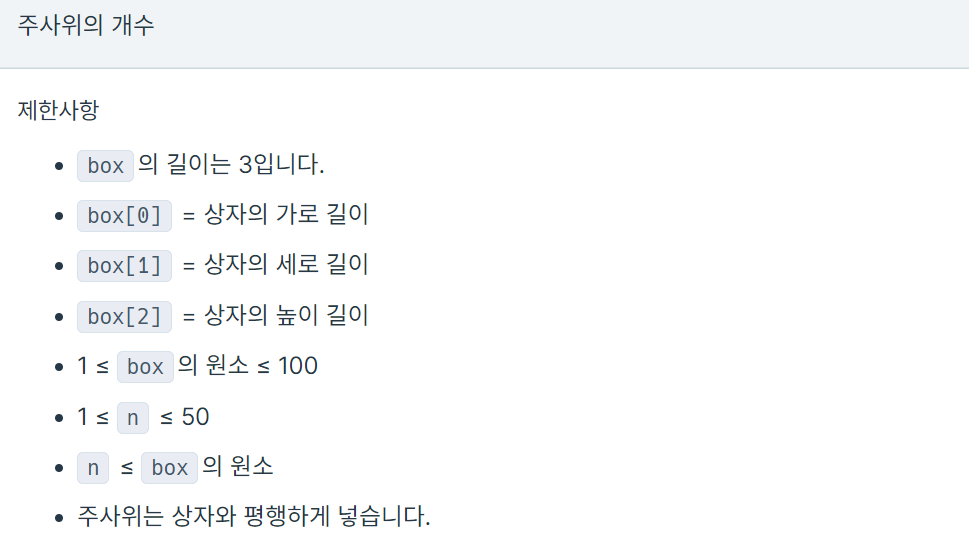 머쓱이는 직육면체 모양의 상자를 하나 가지고 있는데 이 상자에 정육면체 모양의 주사위를 최대한 많이 채우고 싶습니다. 상자의 가로, 세로, 높이가 저장되어있는 배열 box와 주사위 모서리의 길이 정수 n이 매개변수로 주어졌을 때, 상자에 들어갈 수 있는 주사위의 최대 개수를 return 하도록 solution 함수를 완성해주세요.