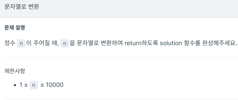 정수 n이 주어질 때, n을 문자열로 변환하여 return하도록 solution 함수를 완성해주세요.