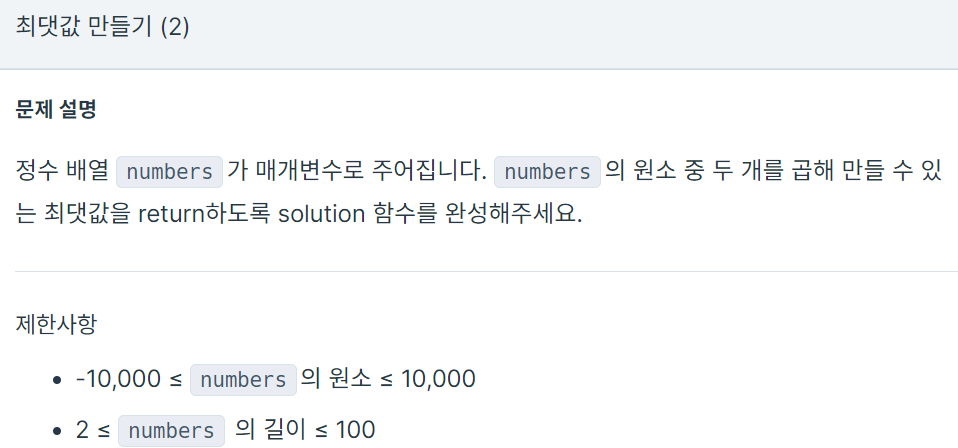 정수 배열 numbers가 매개변수로 주어집니다. numbers의 원소 중 두 개를 곱해 만들 수 있는 최댓값을 return하도록 solution 함수를 완성해주세요.